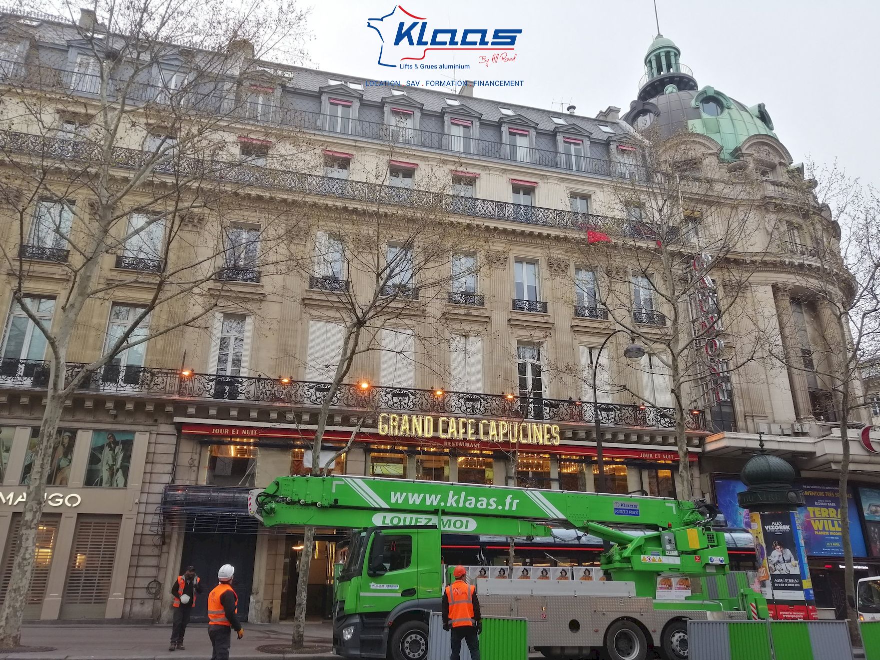 Cette opération s'est déroulée le dimanche matin, avant que les premiers coureurs ne facent leur apparition. Art Levage avait pour mission, le levage de groupes froid sur le toit du Grand Café Capuccines, situé dans le neuvième arrondissement de paris.